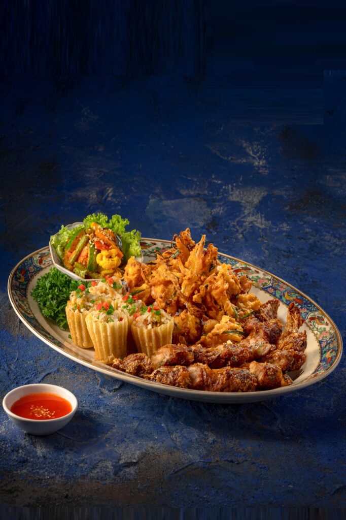 A Nyonya appetizer platter featuring Kuih Pie Tee, Lor Bak, Cucur Udang, and Acar Awak — a perfect mix of savory bites.