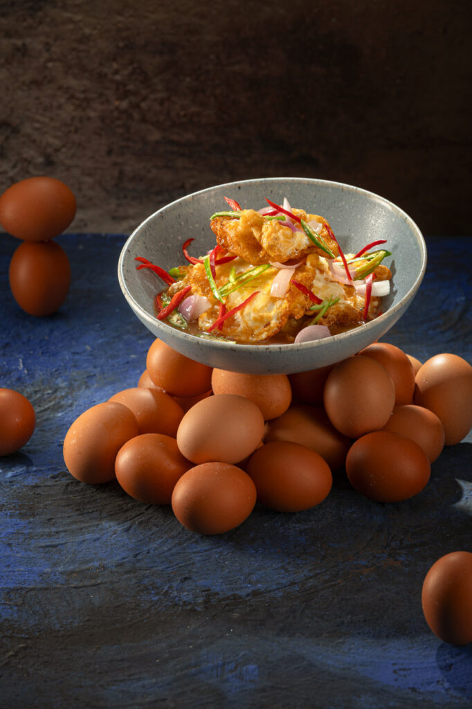 Nyonya comfort dish made by frying eggs and simmering them in a tangy, slightly sweet tamarind-based gravy.