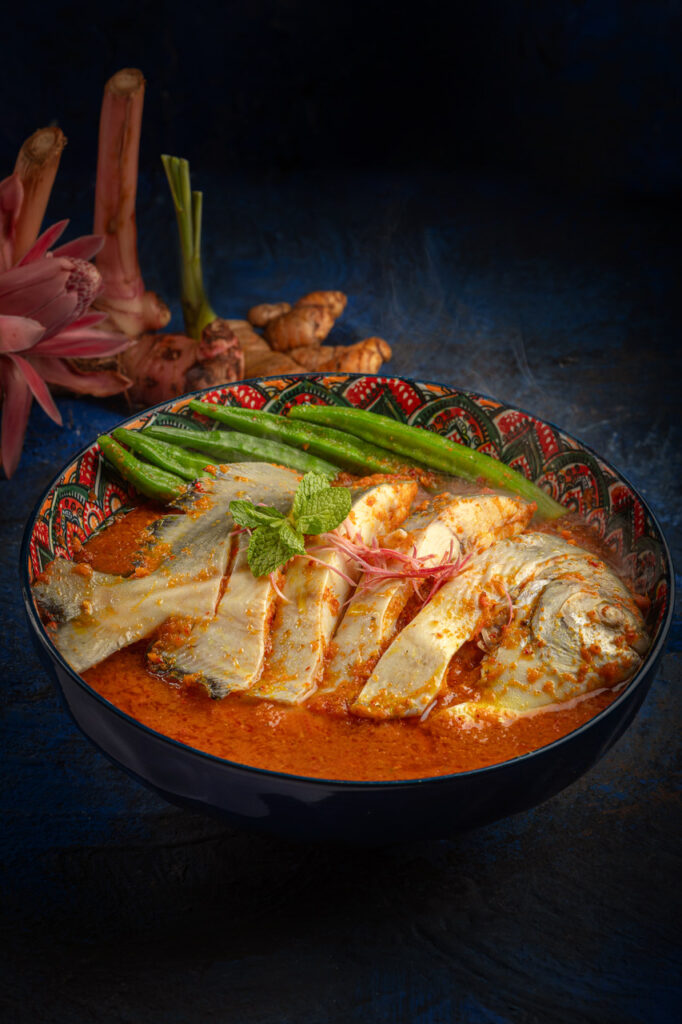 Nyonya-style curry that’s spicy, sour, and aromatic, made with fish or seafood simmered in a turmeric and chili-based gravy flavored with tamarind.