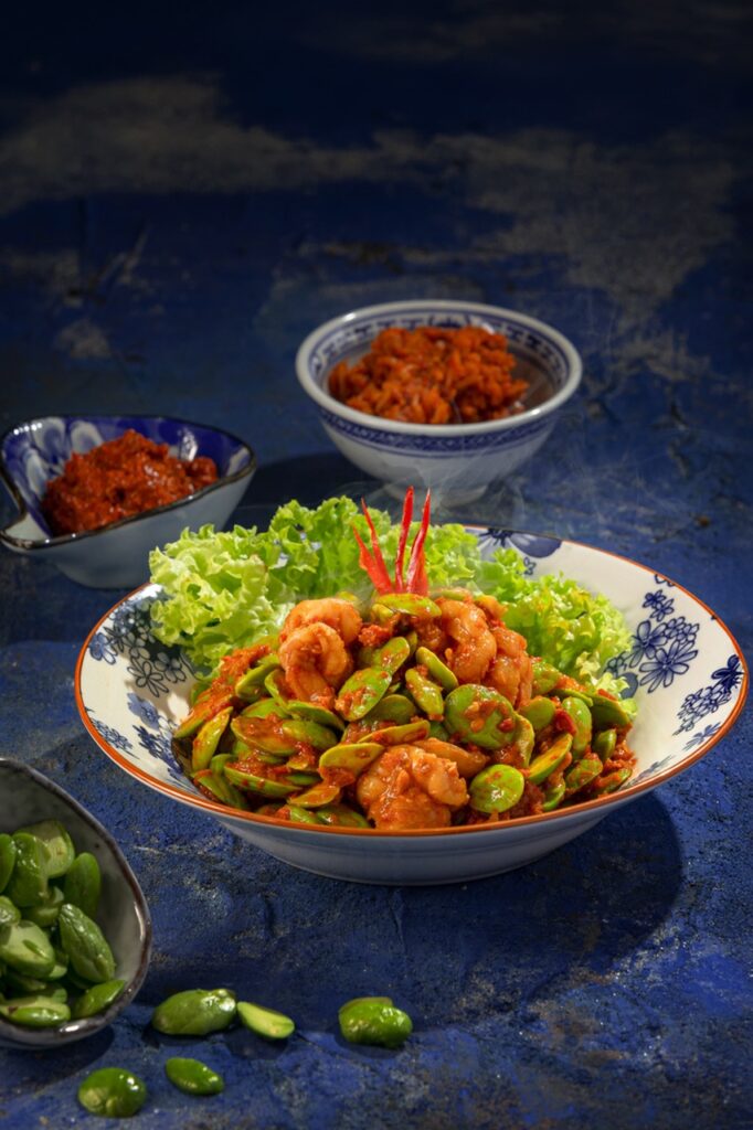 Petai beans stir-fried with prawns in a spicy, tangy, and slightly sweet sambal sauce, a bold and aromatic Peranakan favorite.
